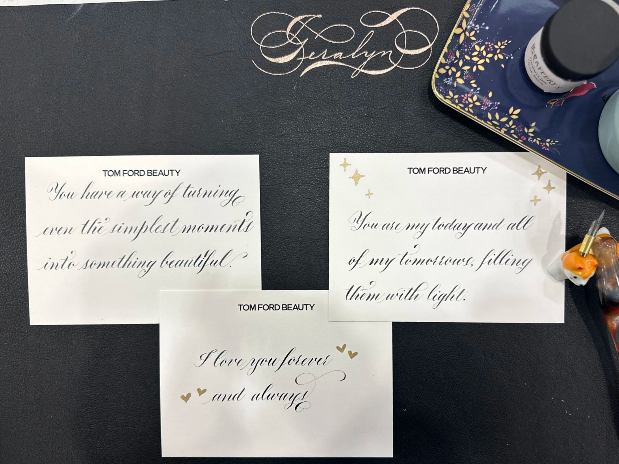 Calligraphy, the art of elegant and beautiful handwriting, is created using carefully formed letters and flourished techniques. Each calligraphed piece is transformed into a unique expression of art.